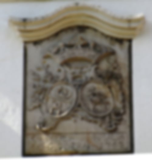 Der Wappenstein über der Eingangstür des Hauses Engelgarten zeigt die Wappen mit der Inschrift: „C. F. Meier und Amalia Schrödern 1767“