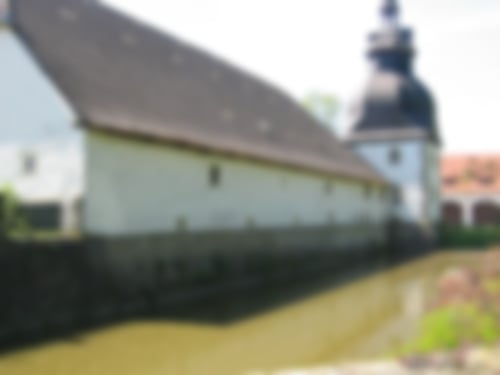 Das Gut Bruche mit dem Herrenhaus innerhalb einer Gräftenanlage.