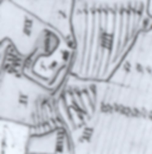 Ein alter Lageplan, der hier gen Norden ausgerichtet ist, zeigt in der oberen Planmitte ein Gebäude mit dem auf die Seite gedrehten Buchstaben „m“, wie Mühle. Direkt unterhalb ist die alte Warmenaubrücke ersichtlich. Da wir keine besseren Hinweise und keine genaueren Textquellen haben, dürfen wir davon ausgehen, dass die darunter befindlichen Gebäude und Gräben Teile der alten Burganlage Ohusen sind.